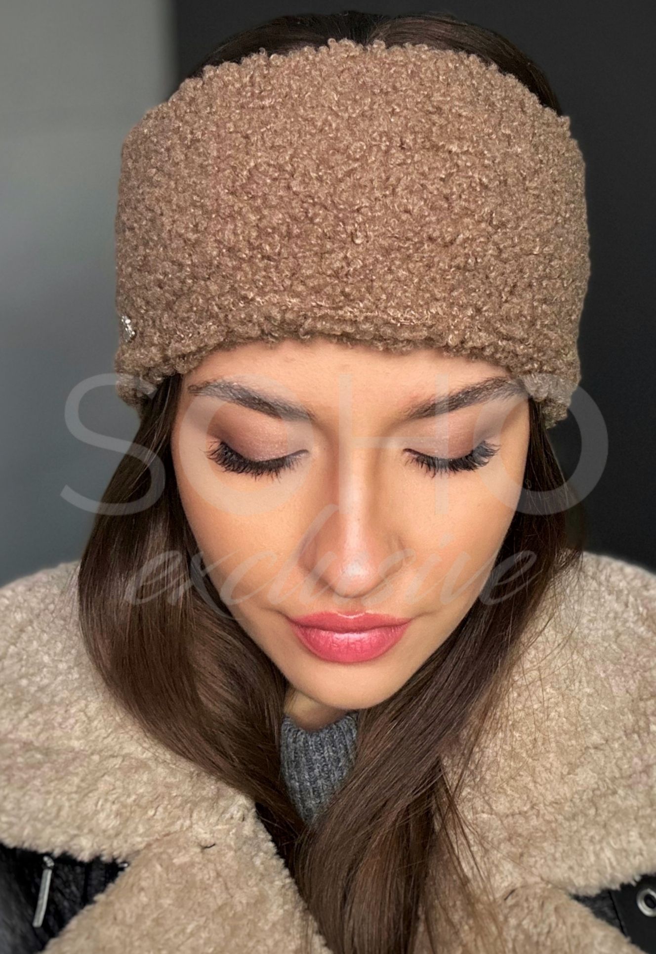 Opaska damska na głowę uszy szeroka ciepła baranek teddy wełna polska brązowa 3024