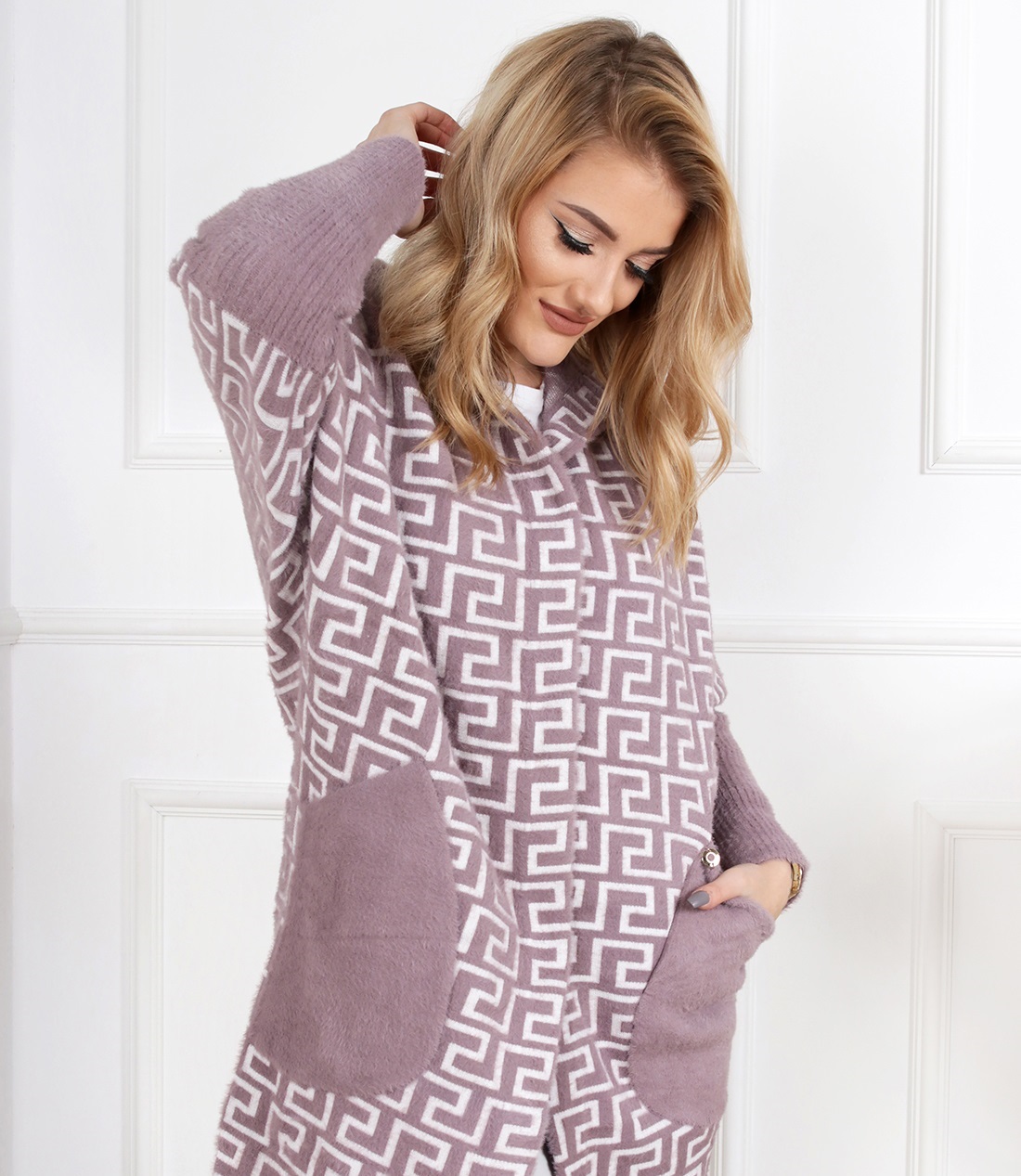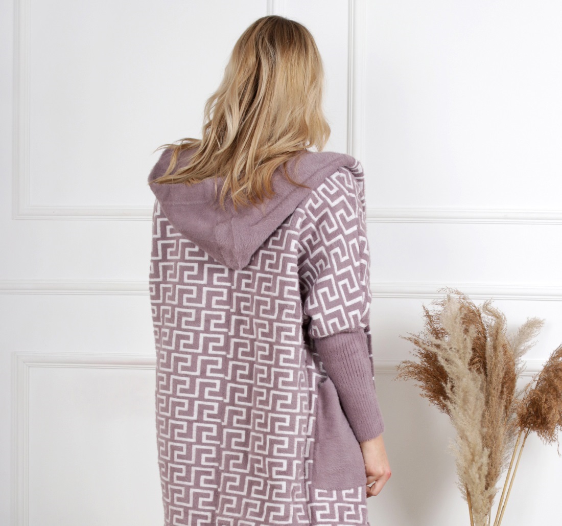 Płaszcz alpaka kaptur wzory damski kobiecy modny elegancki zgaszony lawendowy (z białym wzorem) 2071