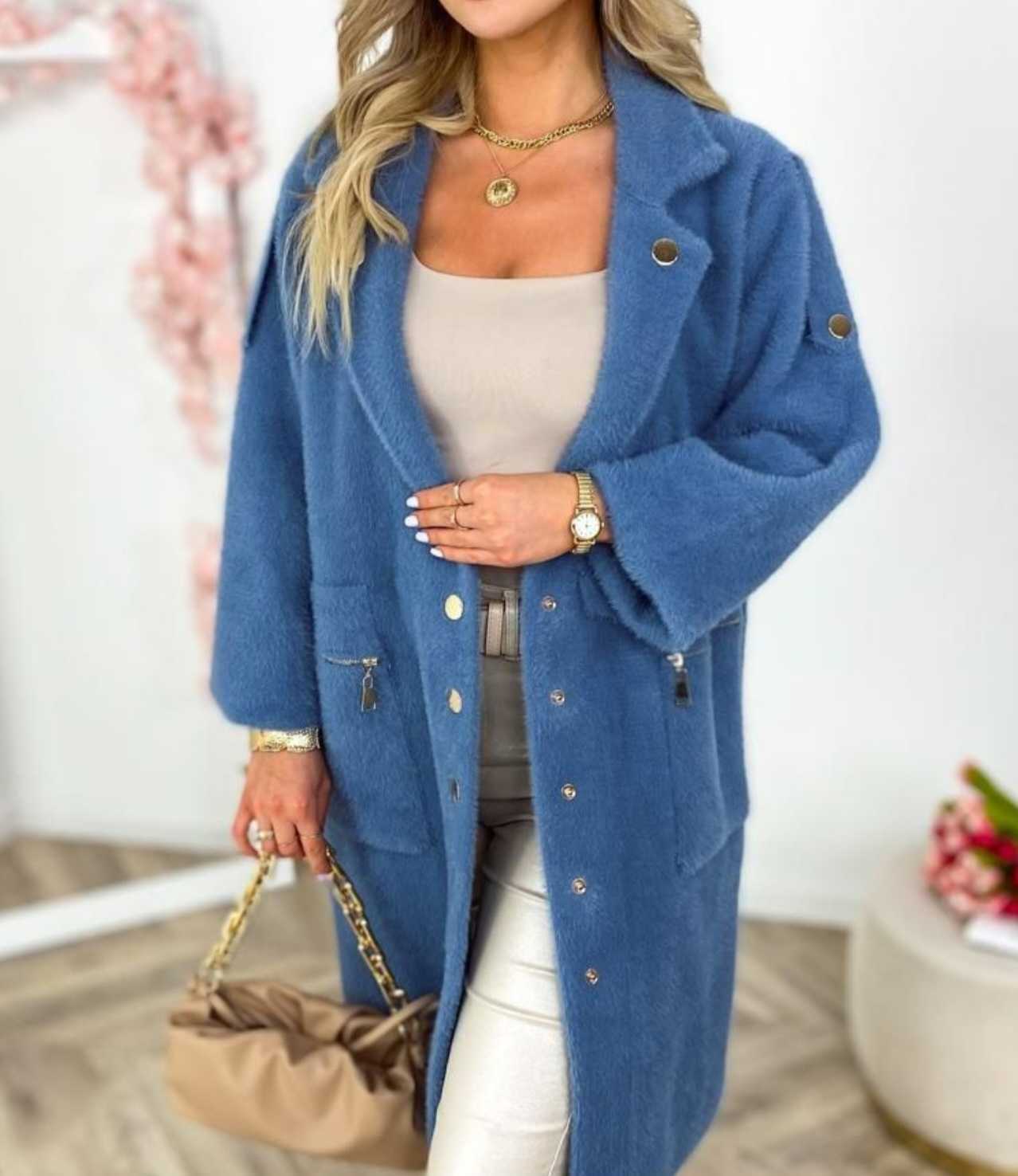 Płaszcz alpaka damska kurtka sweter ciepła długa kołnierz napy jeansowy 2335
