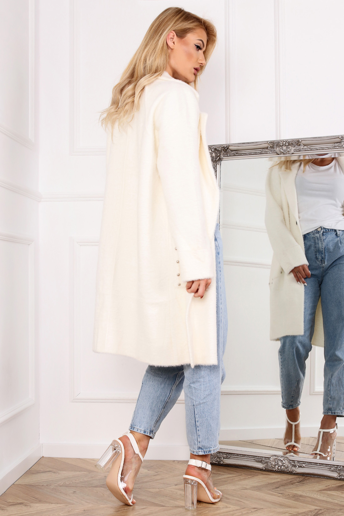 Płaszcz kurtka alpaka kołnierz długi damski kobiecy elegancki ecru 2075