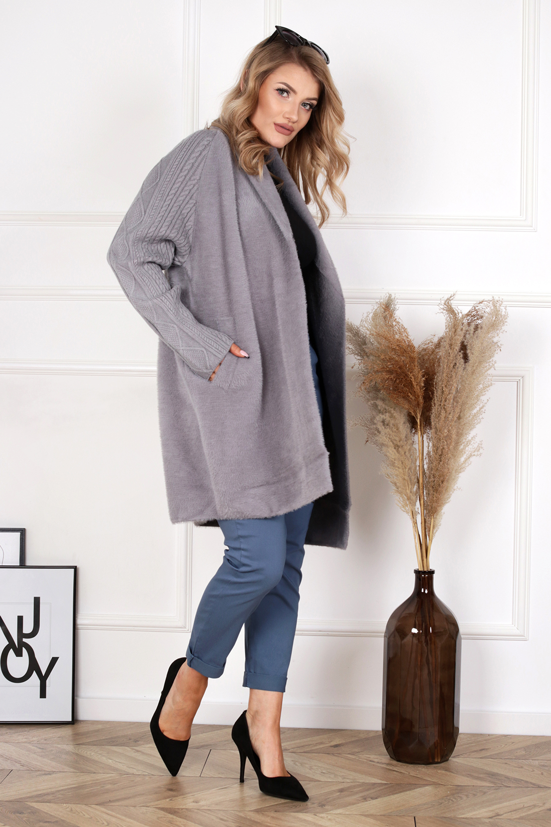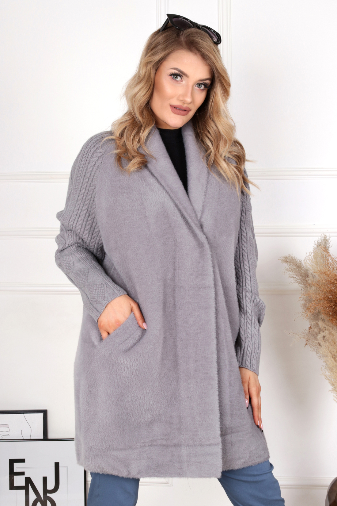 Płaszcz alpaka sweter damski swetrowe rękawy modny elegancki kobiecy szary 2138