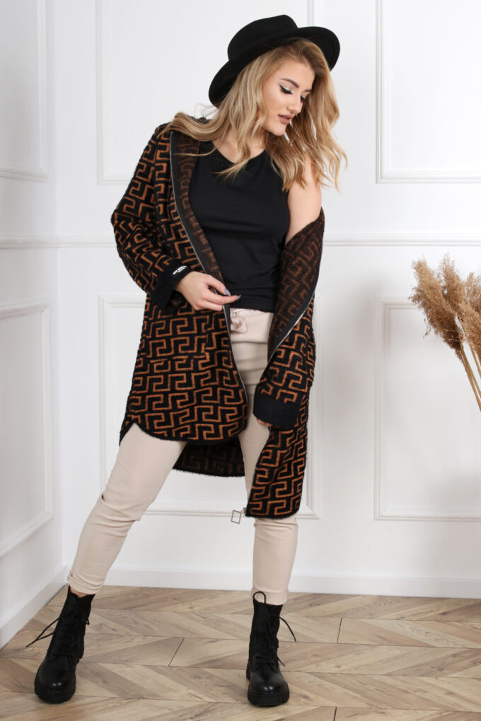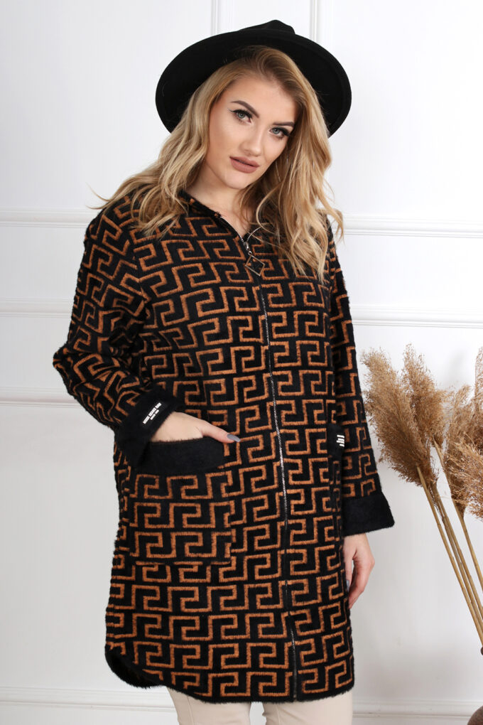 Płaszcz alpaka damski kurtka sweter ciepły długi kaptur suwak wygodny szary (z białym wzorem) 2107